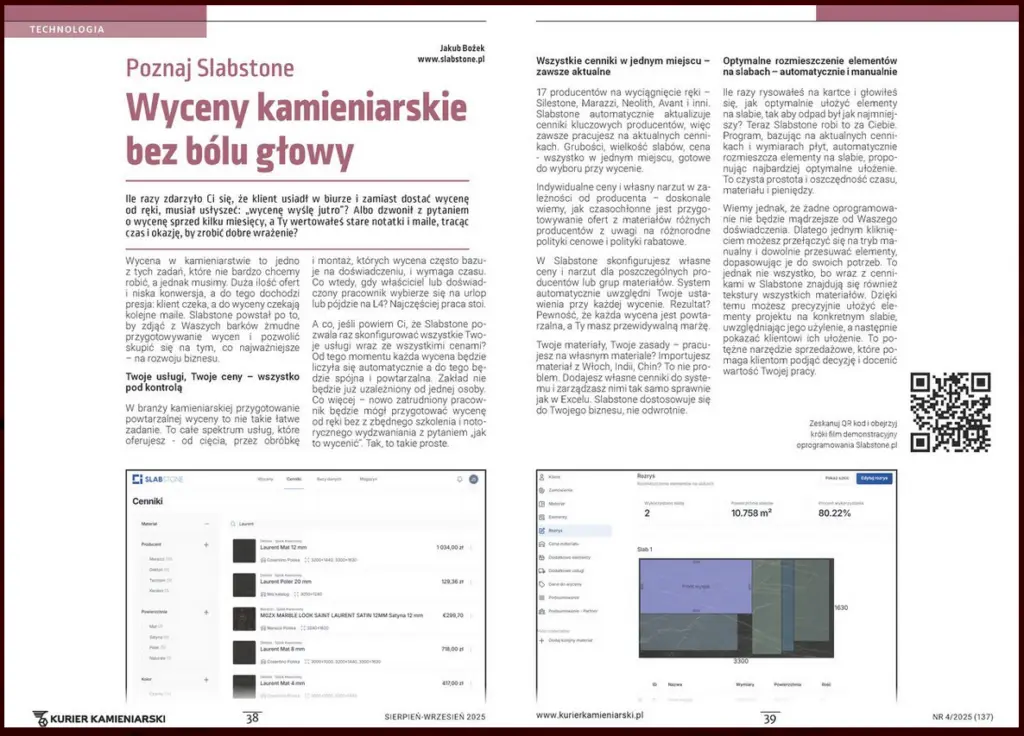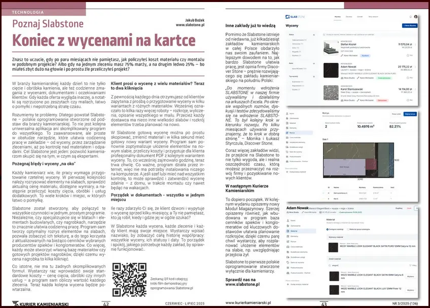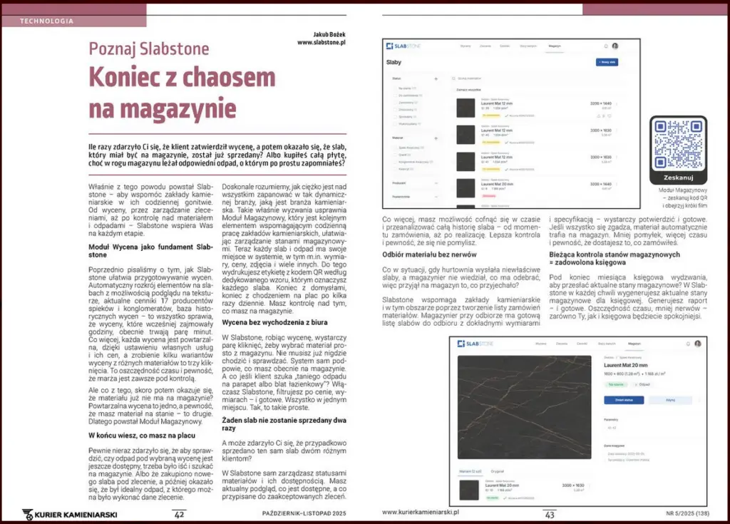 Ile razy zdarzyło Ci się, że klient zatwierdził wycenę, a potem okazało się, że slab, który miał być namagazynie, został już sprzedany? Albo kupiłeś całą płytę, choć w rogu magazynu leżał odpowiedniodpad, o którym po prostu zapomniałeś? Własnie z tego powodu powstał Slabstone – aby wspomóc zakłady kamieniarskie w ich codziennejgonitwie. Od wyceny, przez zarządzanie […]